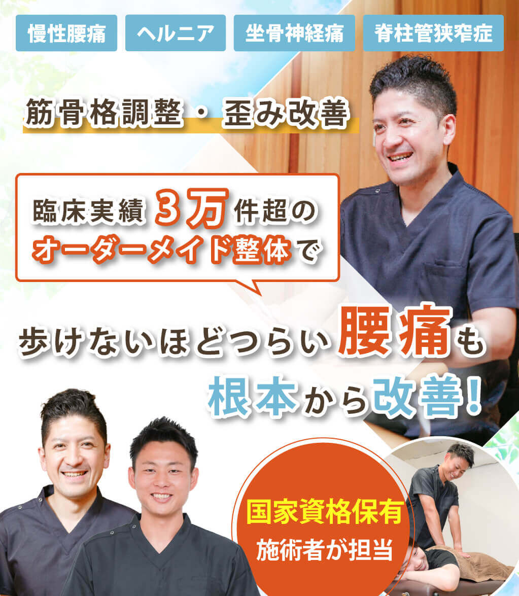 慢性的な腰痛、椎間板ヘルニア、ぎっくり腰、坐骨神経痛など腰痛の経験施術が豊富な整体院です。